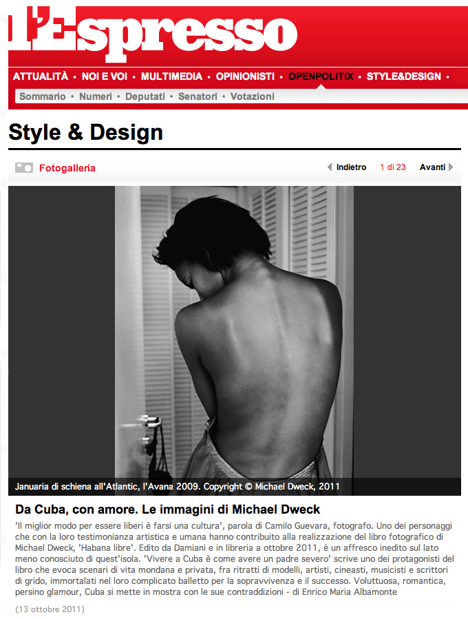 'Il miglior modo per essere liberi è farsi una cultura', parola di Camilo Guevara, fotografo. Uno dei personaggi che con la loro testimonianza artistica e umana hanno contribuito alla realizzazione del libro fotografico di Michael Dweck, 'Habana libre'. Edito da Damiani e in libreria a ottobre 2011, è un affresco inedito sul lato meno conosciuto di quest'isola. 'Vivere a Cuba è come avere un padre severo' scrive uno dei protagonisti del libro che evoca scenari di vita mondana e privata, fra ritratti di modelli, artisti, cineasti, musicisti e scrittori di grido, immortalati nel loro complicato balletto per la sopravvivenza e il successo. Voluttuosa, romantica, persino glamour, Cuba si mette in mostra con le sue contraddizioni - di Enrico Maria Albamonte