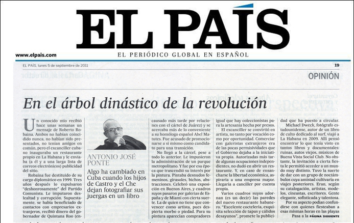 Y, así como Robaina mandó aviso de su negocio a una lista de correos, los dos herederos y sus amigos se han plantado ante el fotógrafo cuyo libro circulará por todo el mundo. Procuran de este modo atraer invitados a sus fiestas: empresarios extranjeros, probables inversionistas, clientes de los cuales sacar tajada, socios con los que intercambiar mensajes acerca de un mundo mejor... El libro de fotografías de Michael Dweck se publicará dentro de un par de meses. The New York Times le ha dedicado ya un artículo. La suerte inmediata de Alejandro Castro Soto del Valle y de Camilo Guevara, su caída o no en desgracia, podrá decirnos mucho acerca de la naturaleza de los cambios en Cuba.